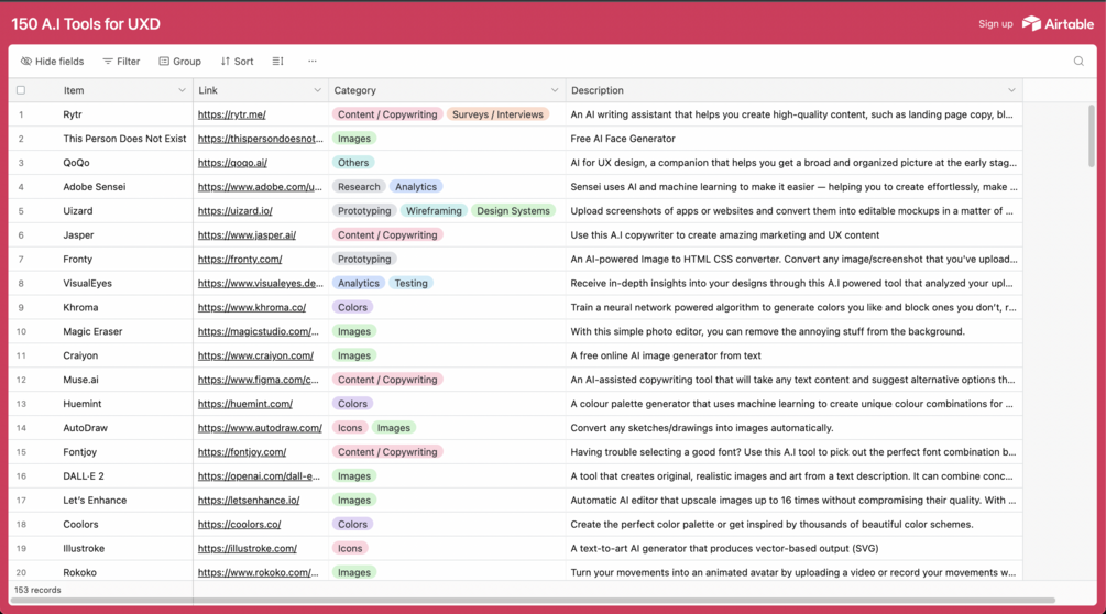 An Airtable of more than 150+ A.I Tools to use for UX/UI/ Design purposes. All entries are tagged and organised into 15 different categories (Eg: Design, Wireframing, Research, Content, Images, Icons etc) for you to filter and check out each tool.