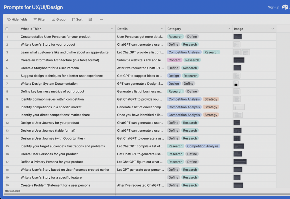All entries are tagged and organised into 12 different categories (Eg: Design, Strategy, Research, Content, Competition Analysis etc) for you to filter and check out each prompt.